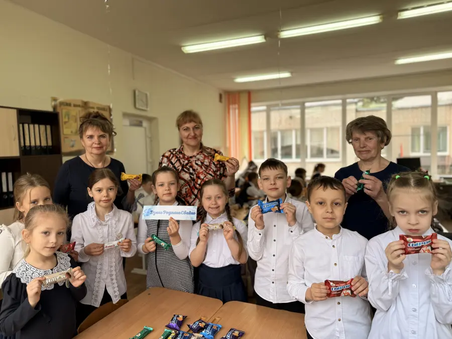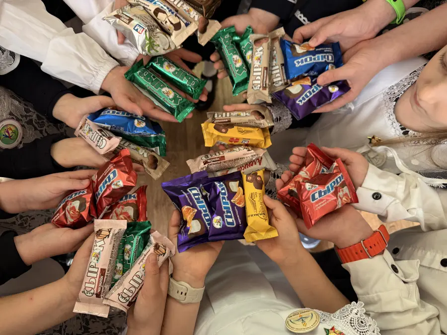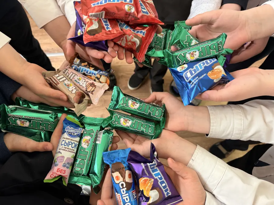 Ребята сегодня принесли глазированные сырки Минского молочного завода N 1 “Молочная страна». Они угостили белорусской продукцией друг друга, ребят из других классов, учителей!