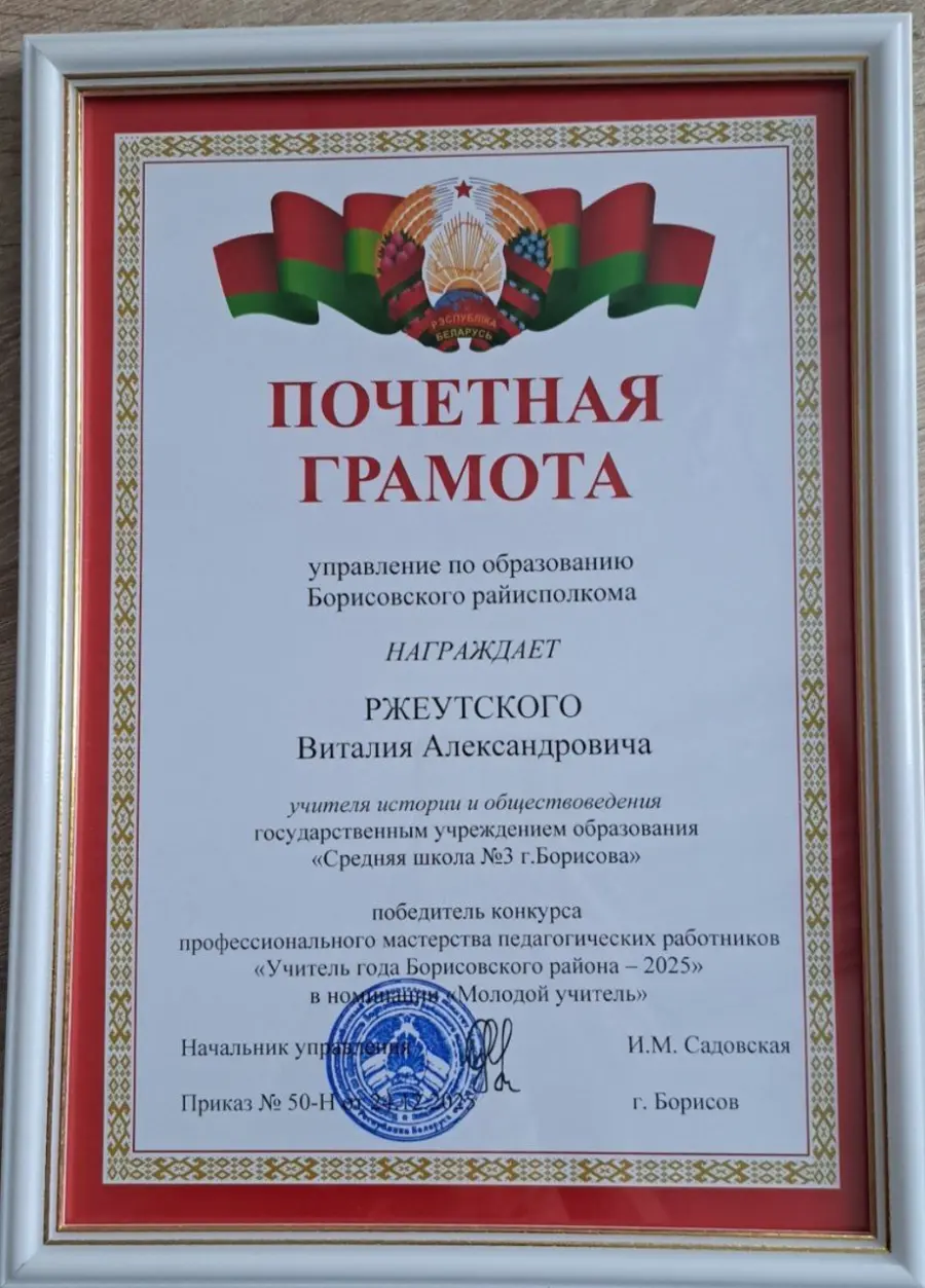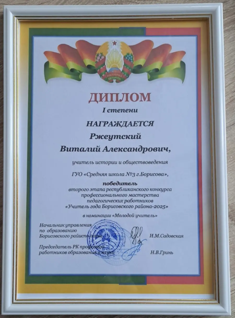 В номинации «Молодой учитель» Дипломом победителя, Почетной грамотой начальника управления по образованию и денежным сертификатом от Борисовской районной организации профессионального союза работников образования и наукинагражден учитель истории и обществоведения ГУО «Средняя школа №3 г. Борисова» Виталий Ржеутский.